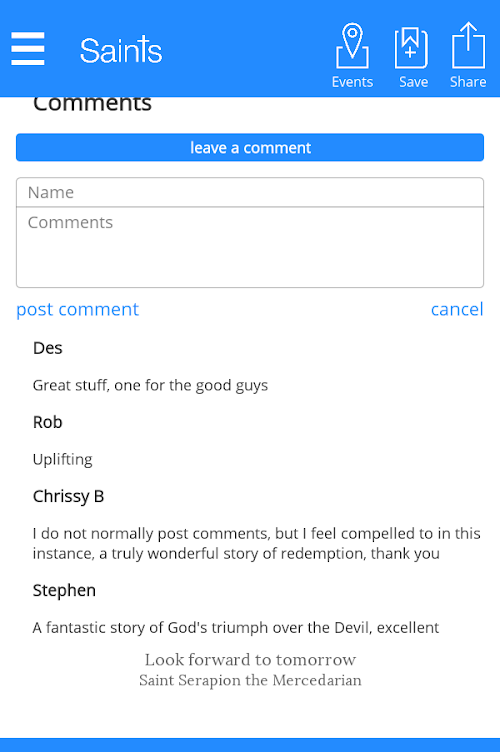 All users will be encouraged to use our comments box for feedback on the Saint of the Day, or for suggestions on how to enhance their experience of the app.