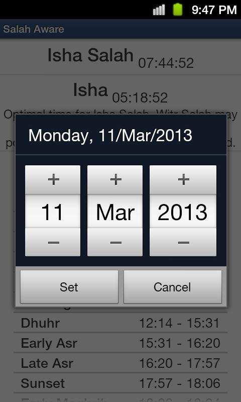 Salah Aware's major difference compared to other Muslim prayer time calculators is that it calculates sky illumination/darkness times according to Quran and sunnah, and not according to Astronomical definitions. Salah Aware takes human eye's perception as basis and does little care about the absolute existence/absence of light. Thus, Salah Aware's calculated Fajr time shows the beginning of horizontal illumination (more specifically, when redness is clearly visible at the horizon) and is significantly different compared to similar programs' calculated Fajr time.