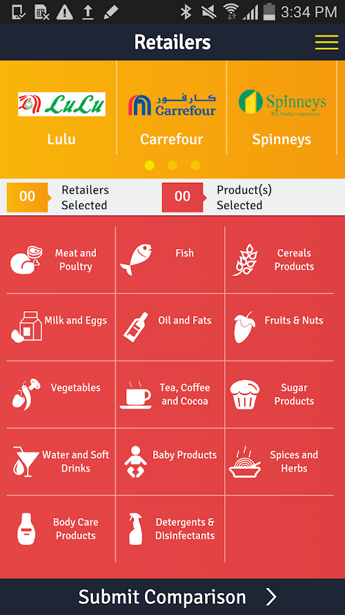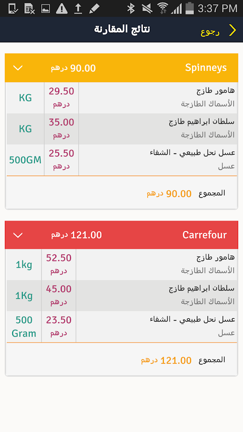 The first stage: You can chose different items you wish to buy, and the second stage: choose any outlets, and the third stage, get a price list for goods that have been selected and the total amount for the products in the outlets that you choose, and you can change the outlets to see the total amount in the other outlet and therefore you can find the best price available in the Dubai market.