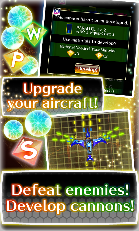 dropped during stages to develop new cannons, equip them in your aircraft’s slots, then go take out the enemy!