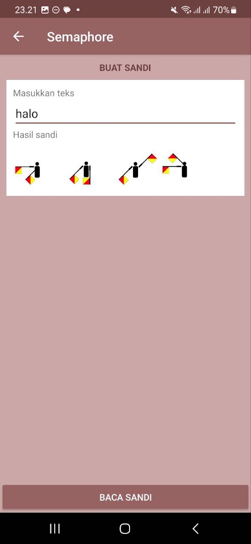 Aplikasi pembuat sandi morse, sandi rumput, sandi angka, sandi kotak, dan semaphore aplikasi yang bermanfaat untuk sekolah. Aplikasi ini bisa digunakan sebagai pengganti buku saku pramuka dalam hal sandi.
