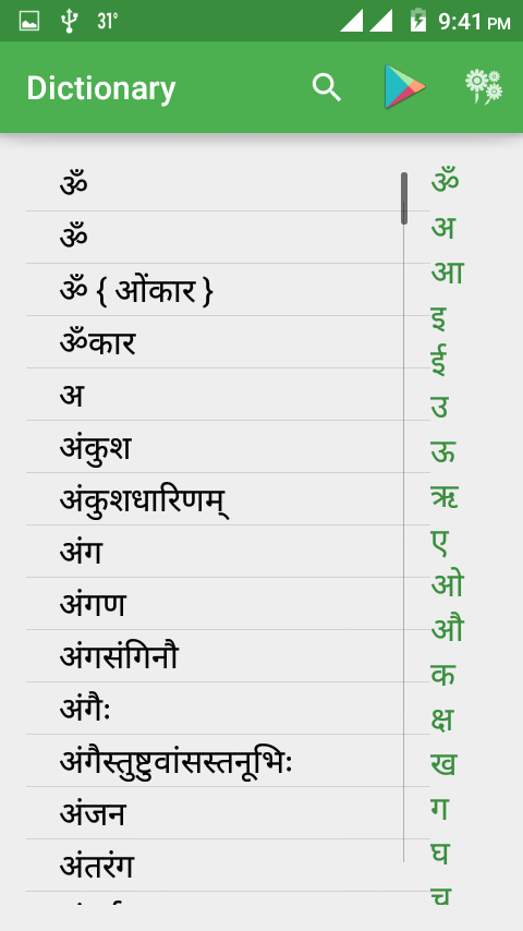 Sanskrit-English Dictionary on Android provides a learning experience as never before.This App has Sanskrit words and their meanings that are intuitive and relevant for the continuously evolving learning needs of today’s kids and adults. Keeping that in mind,words are handpicked.Sanskrit-English Dictionary on Android is infectious; once glued - the quest of Knowledge will never end. If you haven’t tried or tried but are still looking; check it out, NOW!"