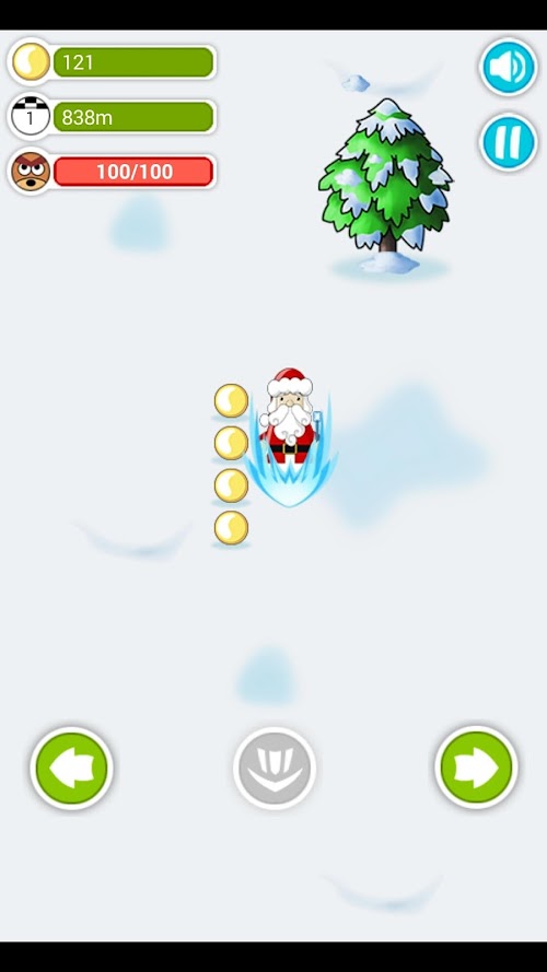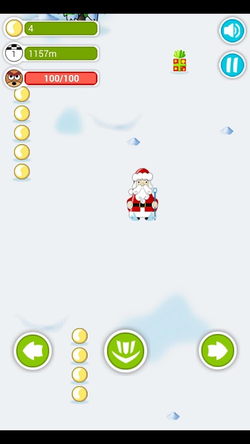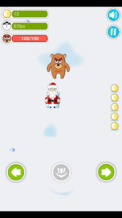Control the Santa to avoid the trees and escape from the brown bear. Collect Christmas Gift on the snow to boost your speed. Collect as many as coins to unlock all characters. There are 4 characters on the game: Santa, Elf, Marsha and The White Bear.