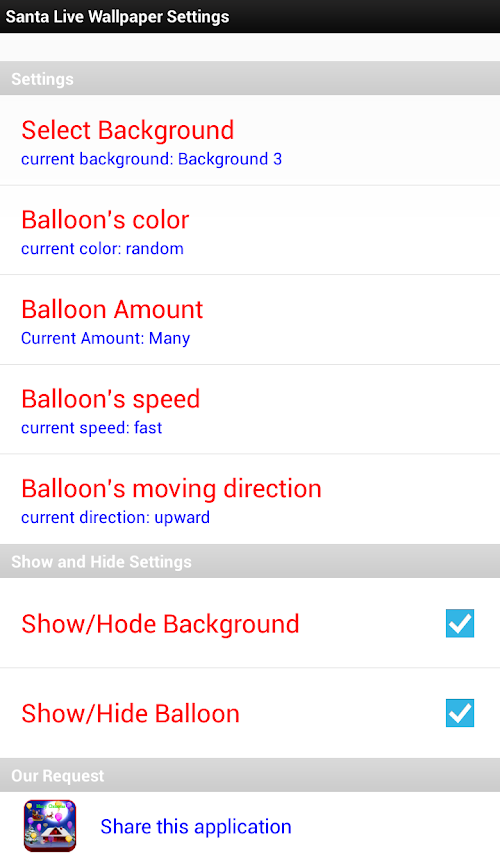 You can find the options in the settings Random backgrounds,Random style of balloons, speed of appearing balloons, random directions.