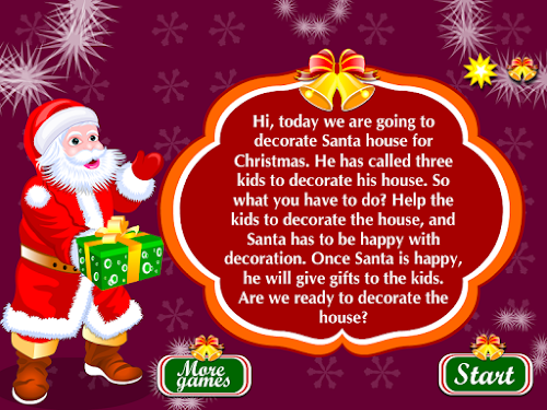 Hi, Christmas is rapidly approaching and Santa knows this and therefore wants to redecorate the house. He will have three guests, three children and because of this Santa wants to have a beautiful house. We all know that Santa loves children because of it she begs you to help him to prepare everything before they arrive. If you want to help him then this kids game is perfect for you, you'll be able to prove that you are a good decorator and a very good friend. Must comply with all instructions of this game with Santa and for this you will receive our help.