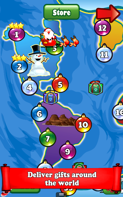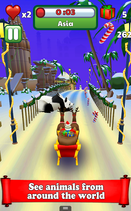 Explore every continent, deliver gifts to every house, escape the gift monster, and see fun animals such as bears, crocodiles, giraffes, penguins, and kangaroos all day into the night!