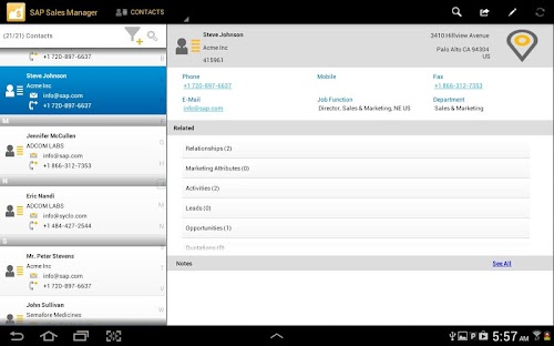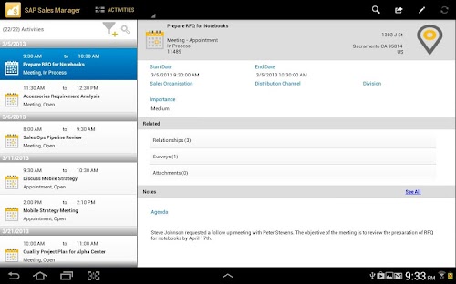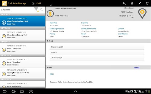 With the SAP Sales Manager mobile app for Android, you have the tools needed to increase revenue, accelerate buying decisions, and maximize productivity anywhere and anytime. The app accesses the SAP CRM application and allows sales professionals to securely execute lead-to-quote-to-order processes right from their mobile device.
