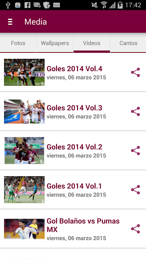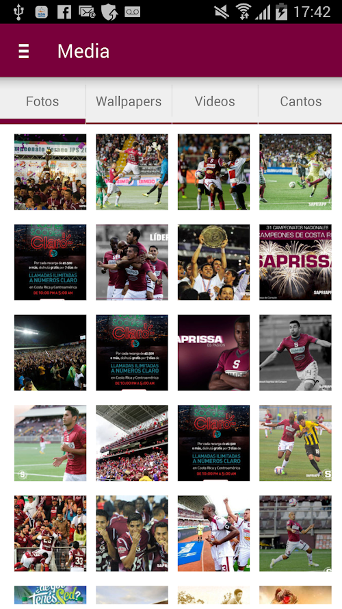 The entire platform allows the user to share both pictures, wallpapers, news, videos and chants on Facebook or twitter.