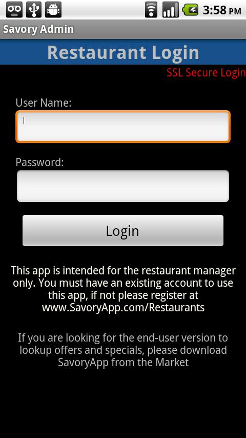 This app is for the Restaurant Owner or Manager with an existing account with SavoryApp. It has no practical application for end-users.