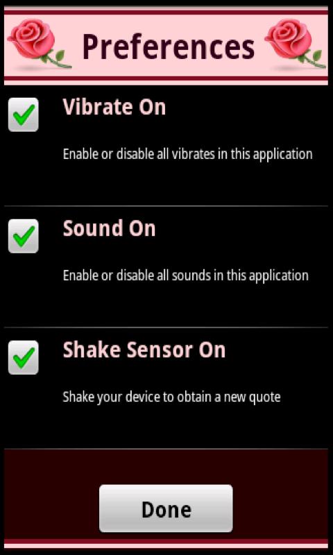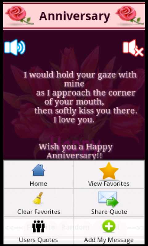 You could store your favorites into the app and view them later using the "View Favorites" menu button. You could clear your current favorites using the "Clear Favorites" menu button. You could send your favorite messages to your loved ones with one easy click.