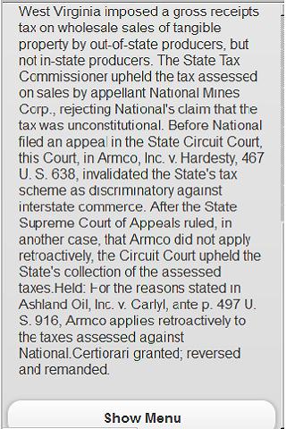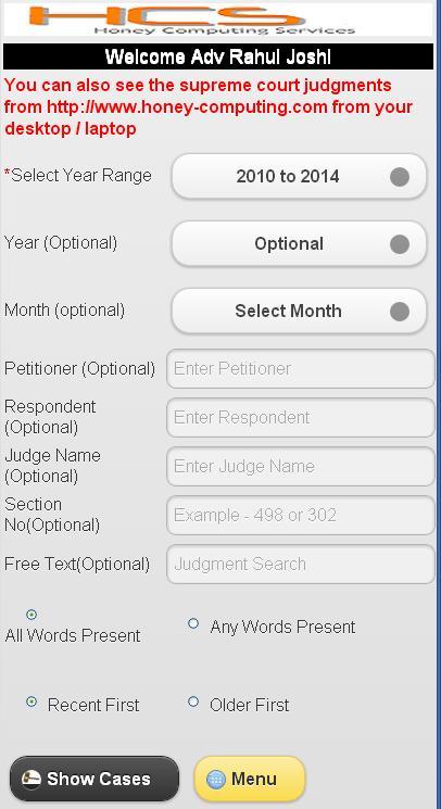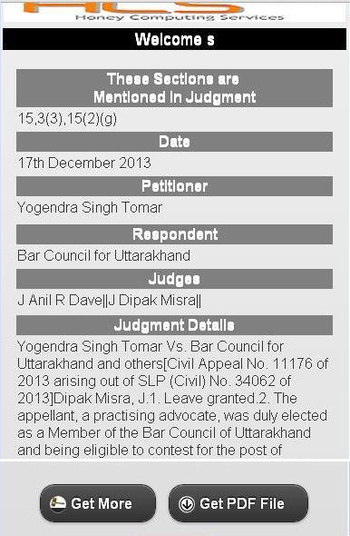 This application helps to search and view around 45000 Indian Supreme Court Judgement details from year 1950 to latest, update process is currently going on for latest judgements, please bear with us if you do not get any latest judgement at any time. we update our servers periodically and we hereby take all the rights to update the database as per our regular database update difference period.
