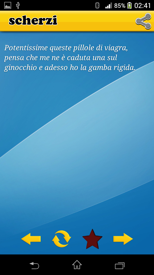 In questa applicazione gratuita avrete la garanzia di trovare un divertente scherzo da mettere nel tuo stato su Facebook o inviare abh un messaggio di testo. Almeno due volte più divertente, i bambini. Impressiona i tuoi amici più di un divertente suoneria! Ti schiaffo te sulla fronte per non scaricare questa applicazione prima! Questa è una delle più popolari applicazioni gratuite disponibili sul mercato Android. Il grande umorismo si ottengono da questa applicazione si stacca su di voi! Provalo subito e vedrai come è divertente.