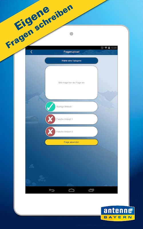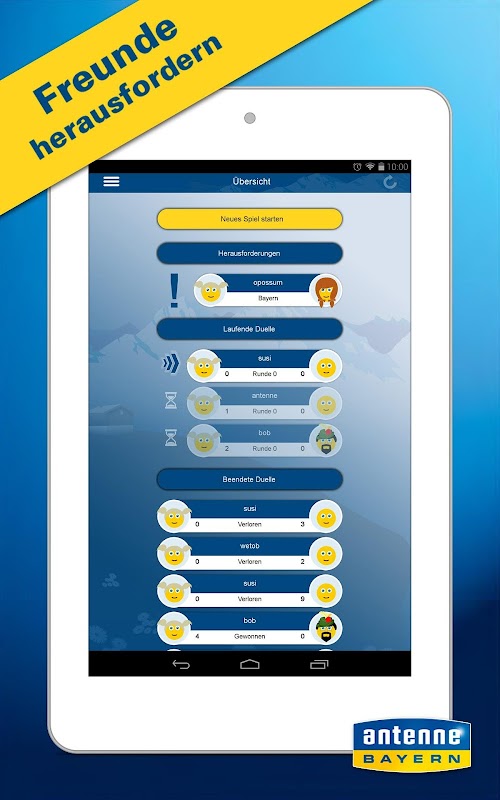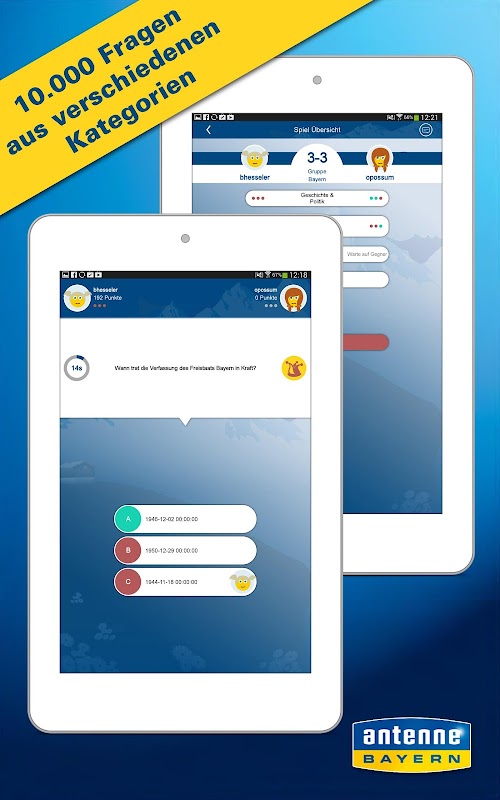 Schlaubayern laden sich natürlich die Premium-Version. Denn, wer im Ranking oben steht, braucht auch mehr Funktionen! Du kannst in der Premiumversion deinen ganz persönlichen Avatar gestalten und verfügst auch über eine ausführliche Statistik. More than 13,000 questions from nature, cuisine, geography, customs, daily life and culture await you: Every day our moderators to quiz together with you at ANTENNE BAYERN to known and unknown facts from our beautiful State. In between, You challenge your Facebook friends and show them who's a real cleverness Bayer! Meet the quizzes in group chat to know nice people and chat with individual players while you battle him. Reasons own groups, invite players a chat to and compete against other groups.