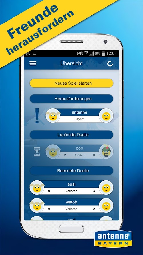 Über 13.000 Fragen aus Natur, Küche, Geografie, Brauchtum, Alltag oder Kultur warten auf dich: Jeden Tag quizzen unsere Moderatoren mit dir gemeinsam bei ANTENNE BAYERN über bekannte und unbekannte Fakten aus unserem schönen Freistaat. Zwischendurch forderst Du deine Facebook-Freunde heraus und zeigst ihnen, wer ein echter Schlaubayer ist! Lerne beim Quizzen im Gruppenchat nette Leute kennen und chatte mit einzelnen Spielern, während du gegen ihn antrittst. Gründe eigene Gruppen, lade Mitspieler im Chat dazu ein und tritt gegen andere Gruppen an.