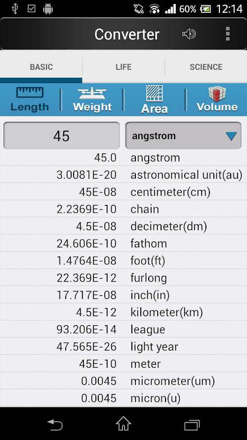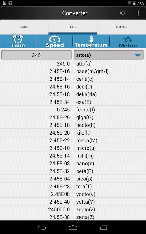 Currently converts different units of the following: length, area, weight, volume, temperature, time, speed, force, energy, power. Great for doing physics homework!
