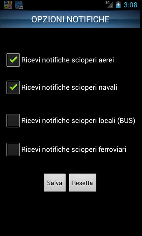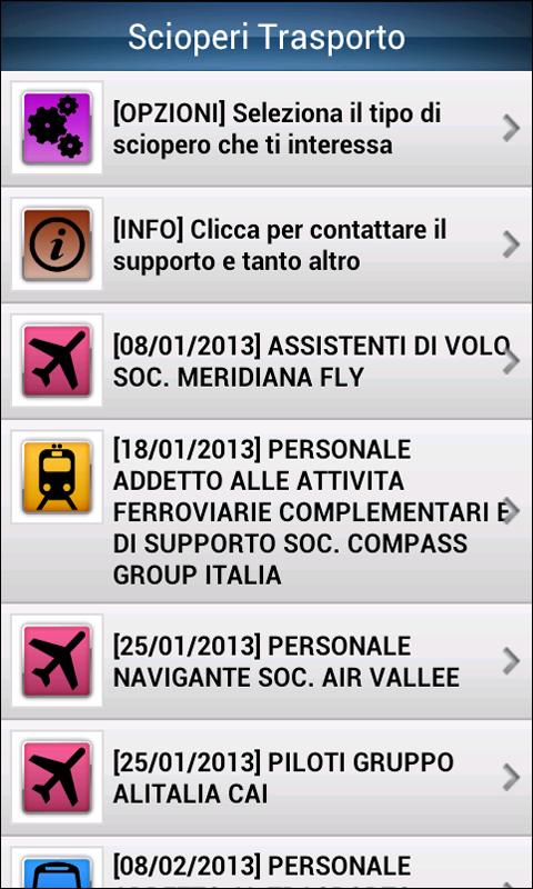 Oppure potrete avvertire i vostri compagni di classe o i vostri colleghi di lavoro per un unico itinerario con una sola automobile! Inoltre in periodo di vacanze sapere se aspettarci sorprese dai traghetti o dagli aerei non è poco, le vacanze possono essere rovinate per molto meno. All'interno dell'applicazione, oltre a poter vedere preventivamente gli scioperi (nel momento che scriviamo fino a tutto febbraio compreso), potrete anche abilitare o disabilitare alcune notifiche.
