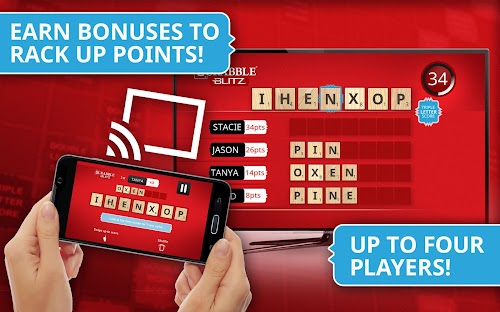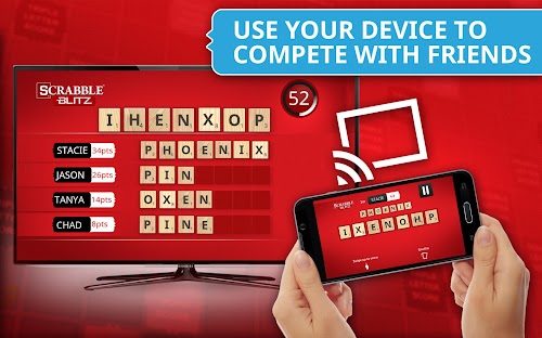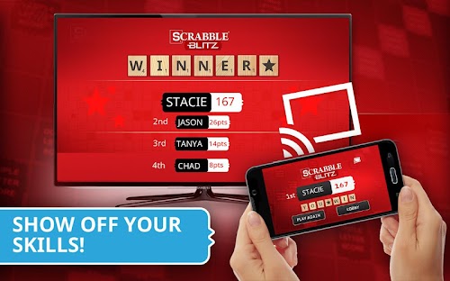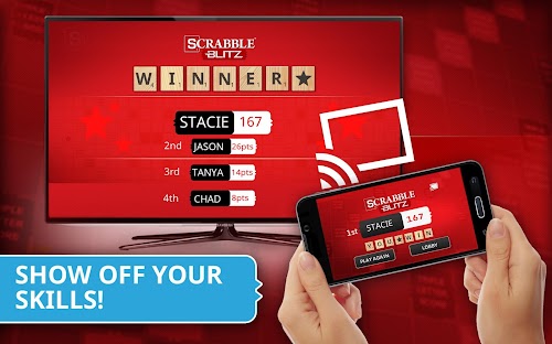 Use your Android device to connect to a Chromecast enabled TV. TAP the tiles on your device to spell words and SWIPE the words up to the TV as fast as you can to earn points. Spell as many words as possible to win each round and master SCRABBLE Blitz.