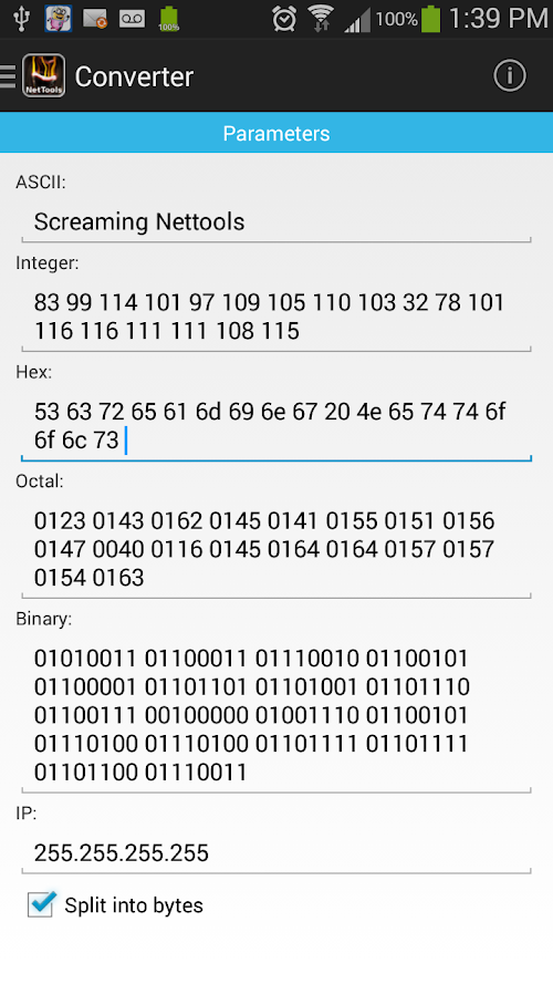 * Converter - Converts between ASCII (text), binary, hex, IP addresses, octal and integers automatically!