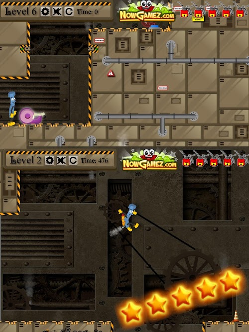 The goal of this game is simple. Complete each level, but understand they will get more difficult how further you get. Screwy the amazing screw-bolt can jump, crawl, hang on the ceiling, stick on the wall and even fly. If you get stuck behind some boxes you easily burn them to the floor. Throughout the levels you will find your gear to use.