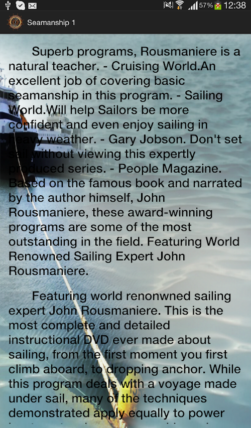 Featuring world renonwned sailing expert John Rousmaniere. This is the most complete and detailed instructional app ever made about sailing, from the first moment you first climb aboard, to dropping anchor. While this program deals with a voyage made under sail, many of the techniques demonstrated apply equally to power boaters, to whom seamanship and navigation skills are as important as to the sailor. Every maneuver and technique is demonstrated clearly with plenty of close ups and action replays. Subjects covered include, basic navigation and planning a cruise, sail handling and sail trim, anchoring and docking, steering and boat handling, safety at sea, what to wear, moving around on deck, knots and rop work and much more.