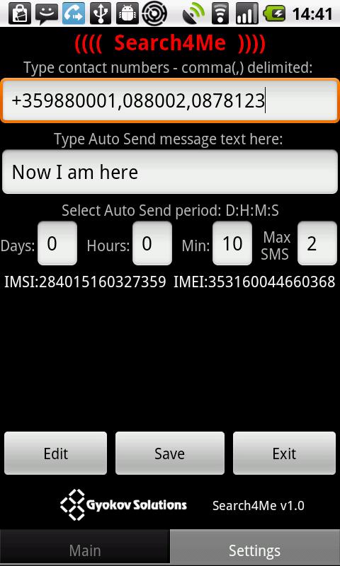 In AUTOMATIC you press , type phone numbers of the recipients,type the automatic message text (50 chars max) and define the timer(days:hours:min) and max number of SMS. Then press to save the settings. Then after enabling automatic send the application will send SMS periodically to predefined contacts.