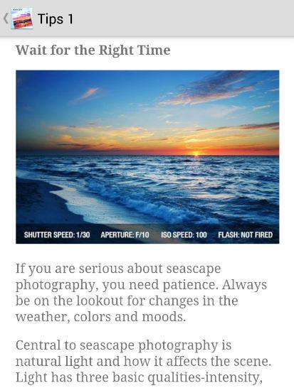 This application is a photography lesson for all photography beginners to learn tips, techniques and some creative photography ideas to take pictures of seascapes.