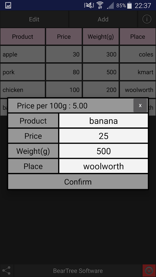4. When a product is selected, an edit dialog appears and it shows you "price per 100g" as well.