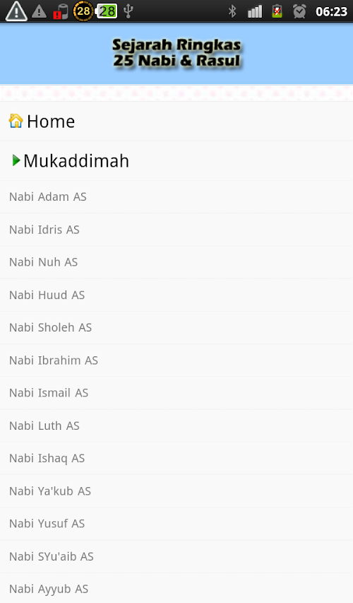 Aplikasi ini berisi sejarah ringkas kehidupan 25 Nabi dan Rasul Islam. Mulai dari Nabi Adam AS hingga Nabi Muhammad SAW. Didalamnya anda bisa membaca bagaimana kesabaran, perjuangan hingga penderitaan mereka dalam mendakwahkan agama ALLAH.