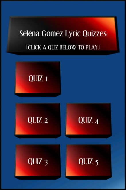 Selena Gomez Lyric Quizzes finds out if you're Selena Gomez Lyric champion. Selena Gomez Lyric Quizzes features 5 quizzes and 5 total questions. In addition, each quiz in the app has 5 lifelines. ensuring maximum fun. Ranging from her early days of Wizards of Waverley Place to her new pop songs, this quiz is sure to test your knowledge. Go head and give Selena Gomez Lyric Quizzes and download today!