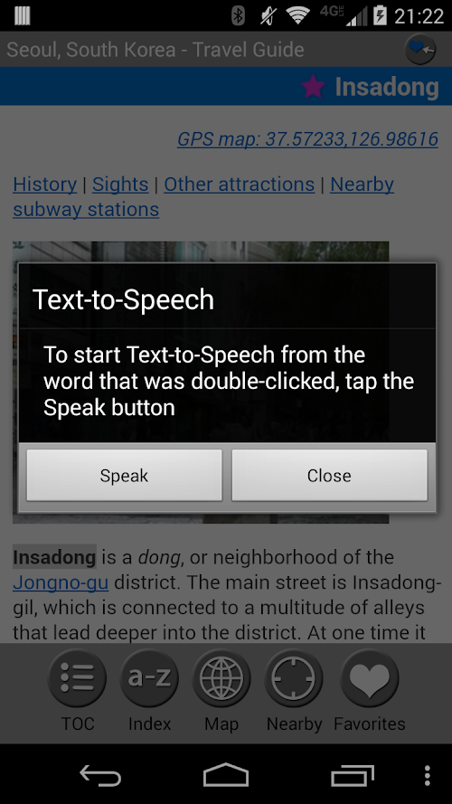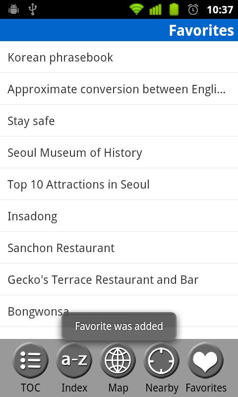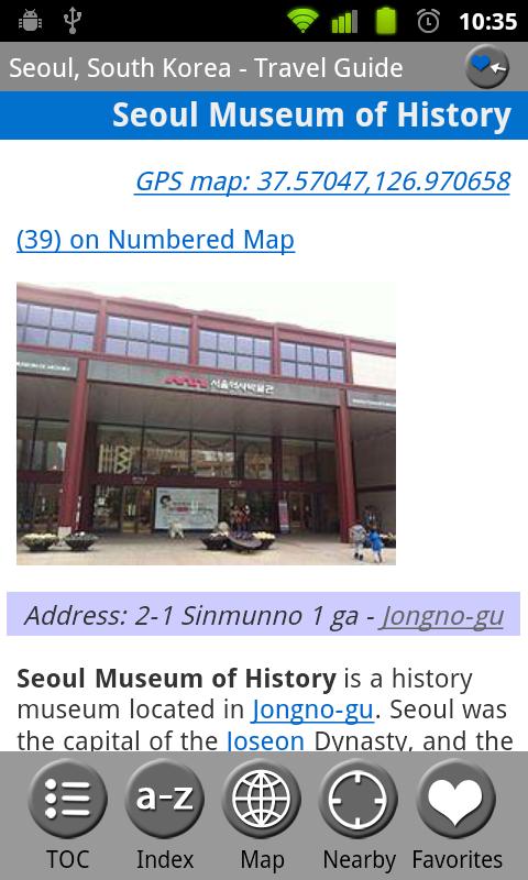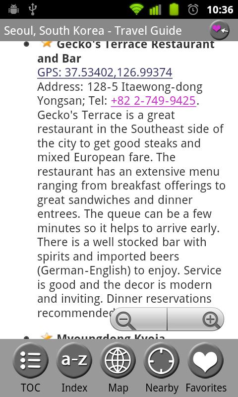 MobileReference Travel Guides provide detailed, practical information about attractions, landmarks, transportation, cultural venues, dining, lodging, history and much more. They are indexed alphabetically and by category, making it easier to access individual articles. Attractions can be viewed on an offline GPS map along with your current location so that you can easily find attractions near you as you explore the city.