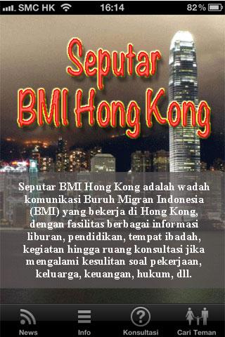 Seputar BMI Hong Kong adalah sebuah aplikasi yang dibuat berisi berbagai informasi dan sarana yang dibutuhkan oleh BMI Hong Kong. Lebih dari 150 ribu BMI yang sedang bekerja di Hong Kong.