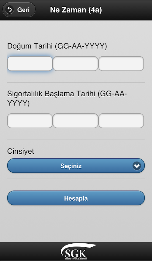 Doğum tarihi, ilk işe başlama tarihi ve cinsiyet dışında hiçbir kişisel bilgi istenmemektedir. Service Delivery Directorate General of Social Security