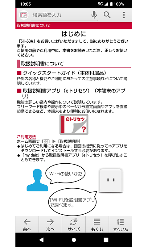 「SH-53A」の取扱説明書として閲覧できるだけでなく、一部の機能については説明文から端末設定などを直接起動することができますので、SH-53Aをより便利にお使い頂けます。