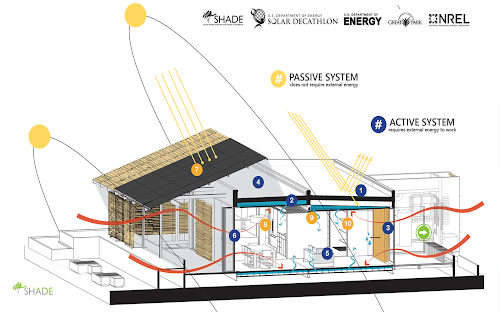 SHADE stands for Solar Homes Adapting for Desert Equilibrium. In the American Southwest, only those species most adapted to the extreme desert climate can thrive. Our Solar array is liberated from the roof and creates a solar canopy, which in its turn provides shades for the most exposed facades of the house. This app focuses on the systems used in SHADE.