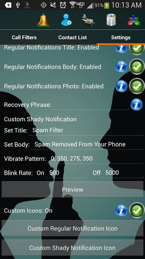 ★ Shady features the best picture, video and audio filter on the Play Store. After your device downloads the MMS attachments Shady will filter it!