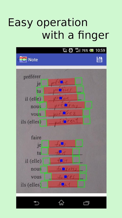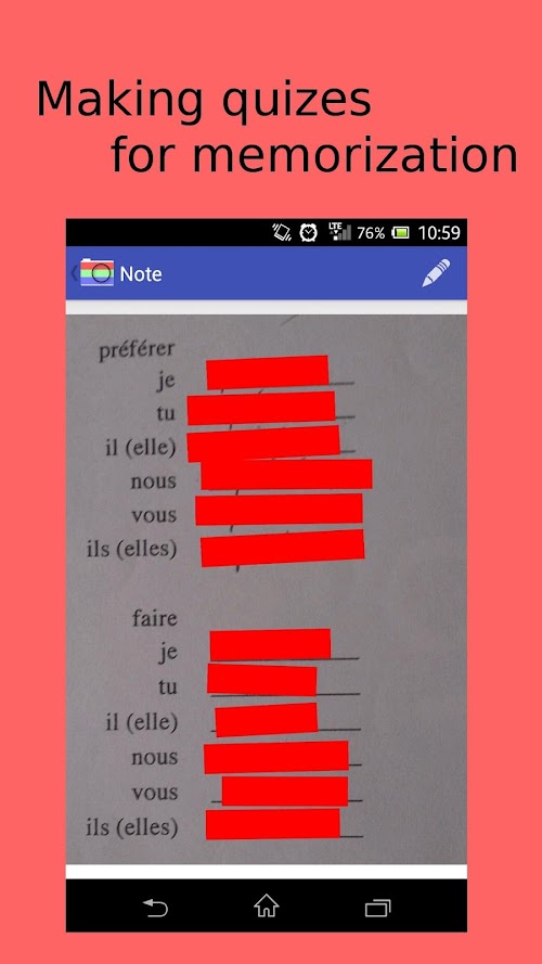 This app make quiz for your memorization. First, you take a photo of words or sentences which you want to memorize. Then, you can draw lines over them to hide. Now you finish to make a quiz. Finally you can test if you have already memorized those to touch the lines.