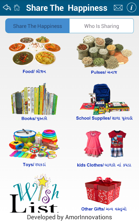 Share The Happiness app - Easy and intuitive app to share your happiness with Anganwadi kids launched by Vadodara Mahanagar Seva Sadan (VMSS). It allows citizens to donate food, clothes, school supplies, toys, and various other items to kids (0 - 6 years) at Anganwadis. You can also view "Who is Sharing" around you on the map.