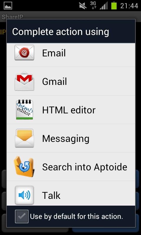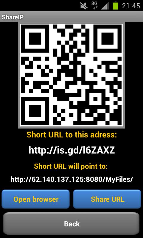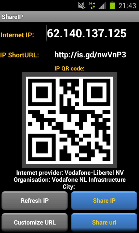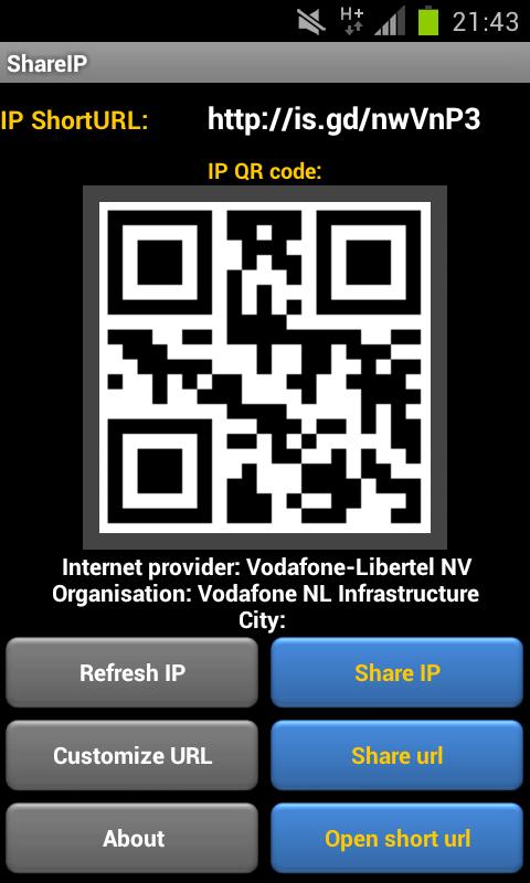 Quickly share your IP address? Share ip does exactly that. It shows your Internet IP address in text and QR code and creates a temporary shortURL to it. You can adjust the protocol, port and file location to the IP shortURL. You can very Easily share your IP address or short URL via QR barcode, SMS, MMS, Email, GTalk, WhatsApp or Bluetooth.