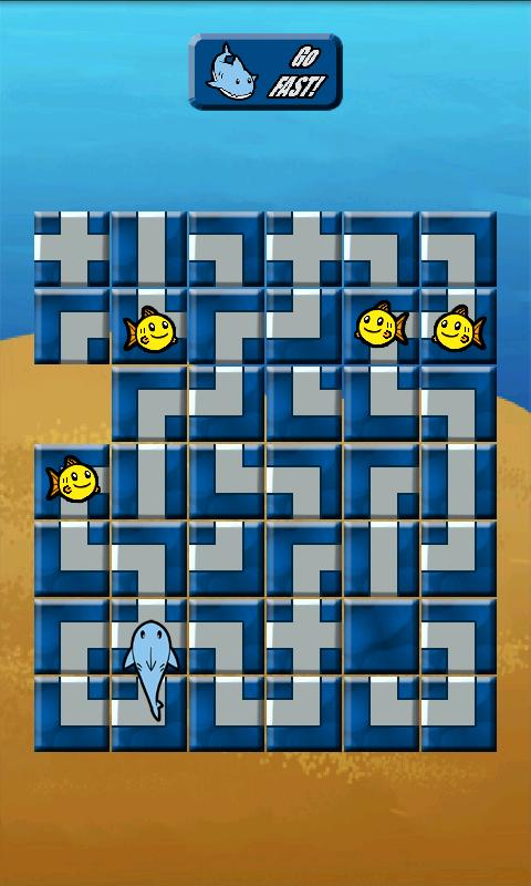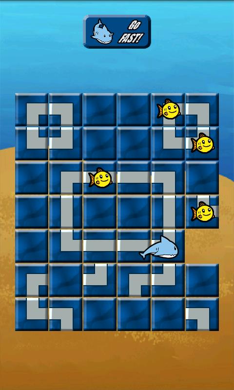 Shark Bait is a sliding puzzle/action game. Your shark is always moving, and you must create a path for him to get to his prey! Swipe your finger up, left, down and right in order to move tiles around. You can move the tile your shark is on too, but be careful! Press the Go FAST button to speed up once you have a path (or to pull off tricky maneuvers).