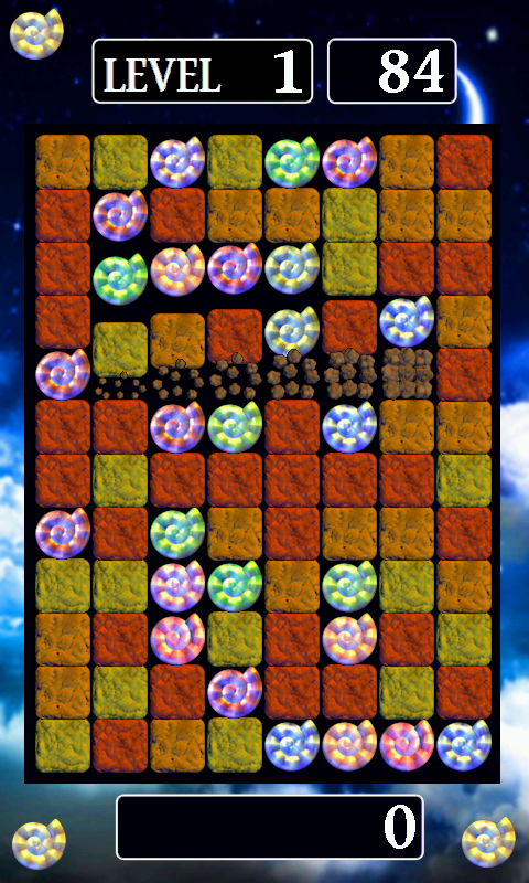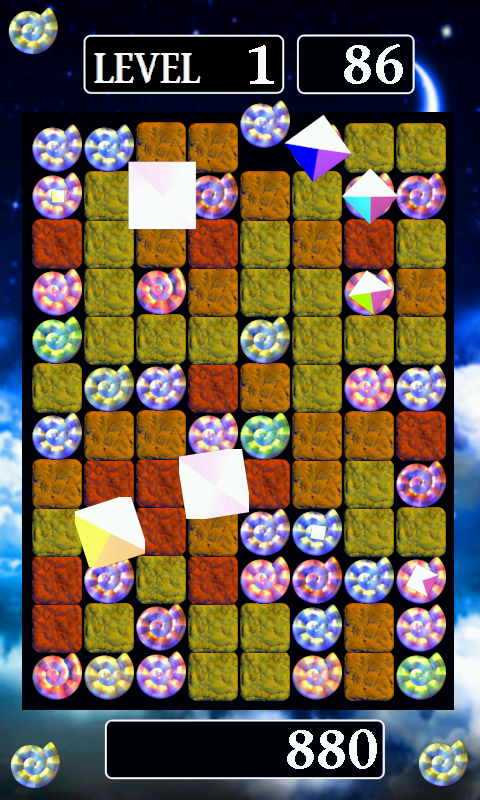 Get ready for some fast-paced shell breaking action! Drag your finger across unwanted dirt tiles to make them crumble, letting your shimmering shells fall into place! Line them up in horizontal rows for points and more time! Touch a "B" icon to destroy all blocks of that color. Touch a "C" icon to turn all blocks of that color into shells!