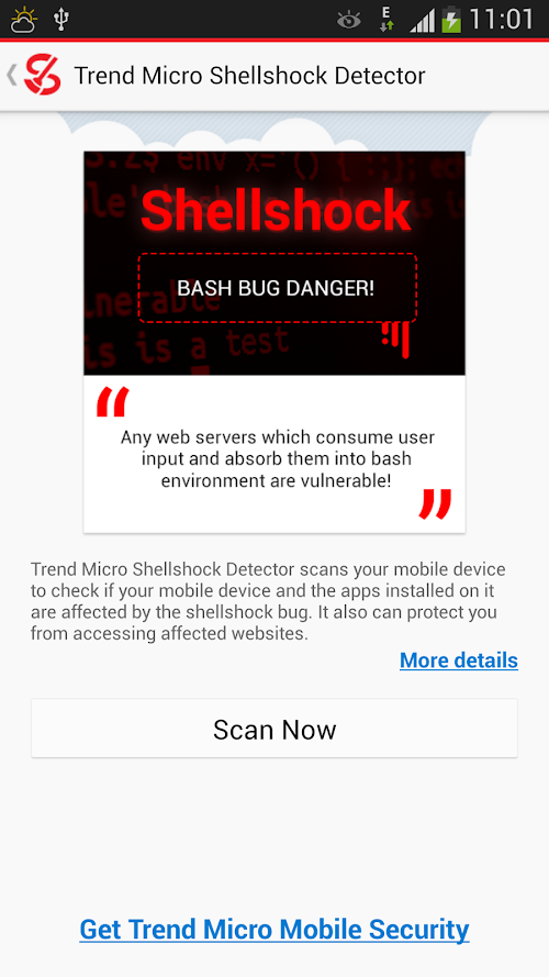 Trend Micro Shellshock Detector scans your mobile device for possible risk and helps you stay away from the Bash bug.