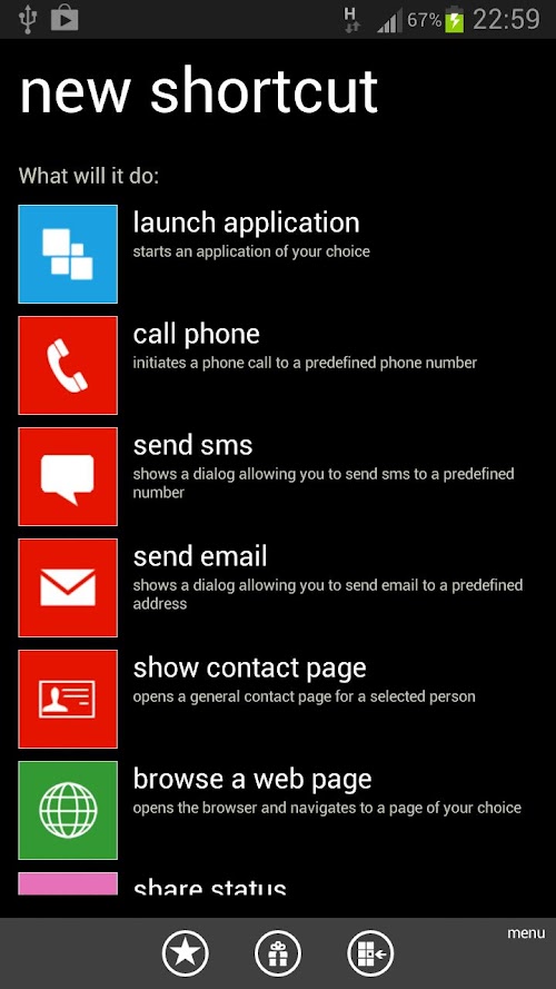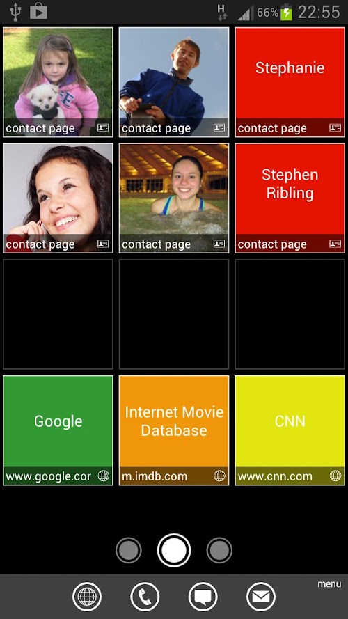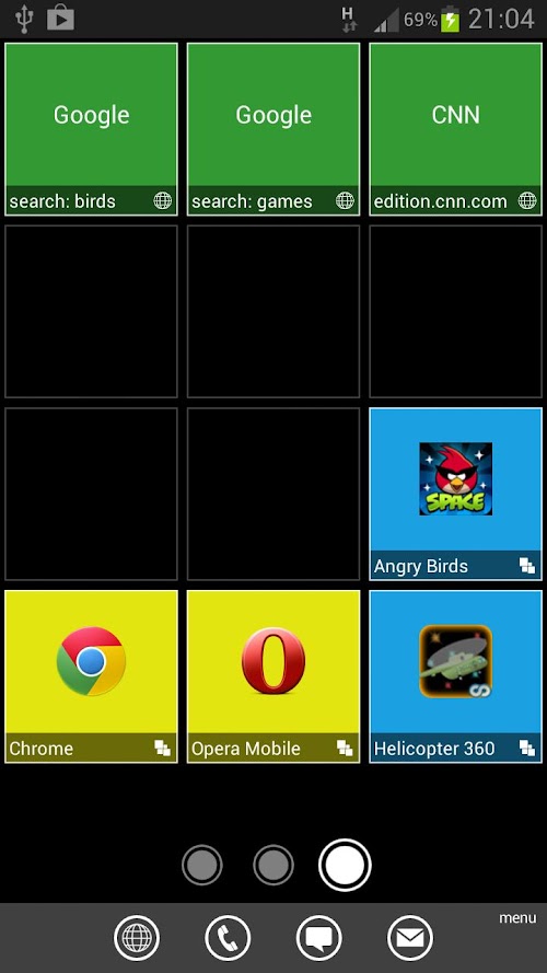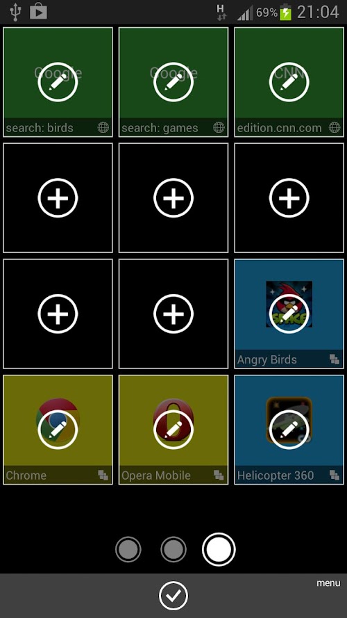 Once defined, shortcuts are presented as a grid and you just need to tap on the shortcut you want to invoke. You can reorder the shortcuts by drag and drop. To provide more space for shortcuts the app has three pages - main, left and right. The main page is active when you launch the application and the other two are only a swipe away.