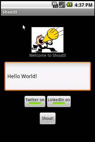 This application is designed for people who push status updates to both Twitter and LinkedIn in a fast, simple way. Upon launching the application, you just login with your Twitter and LinkedIn accounts, and ShoutIt! Shoutit makes it easy to share your message (include text, photo or video links). At the same time, your new status will be posted to both your Twitter and LinkedIn feeds.