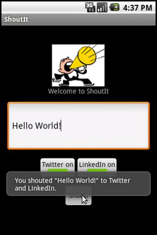 This application is designed for people who push status updates to both Twitter and LinkedIn in a fast, simple way. Upon launching the application, you just login with your Twitter and LinkedIn accounts, and ShoutIt! Shoutit makes it easy to share your message (include text, photo or video links). At the same time, your new status will be posted to both your Twitter and LinkedIn feeds.