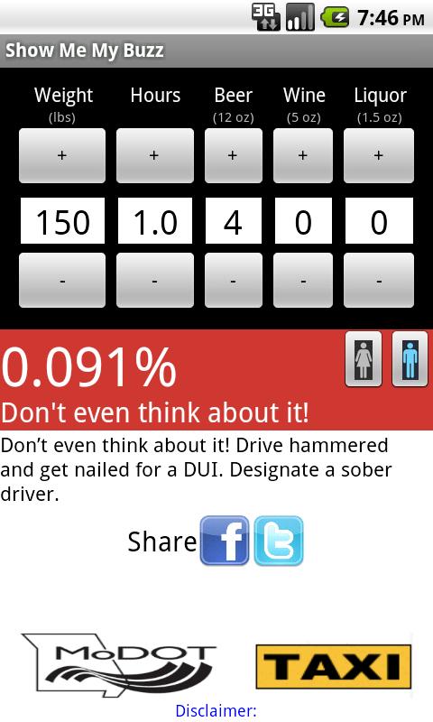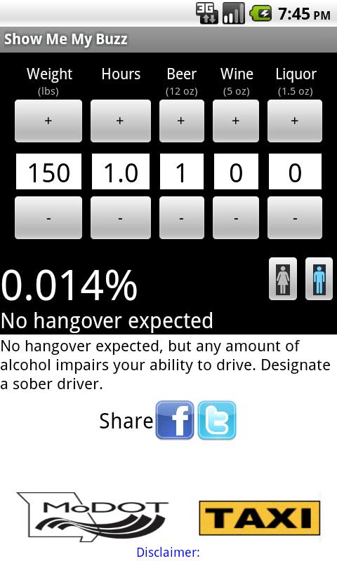 For this calculator, one drink is considered to be equal to 12 oz. of beer, 5 oz. of wine or 1.5 oz. of hard liquor.