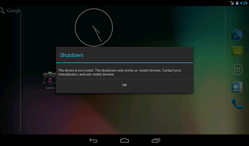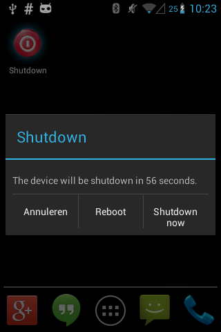 This application can reboot or shutdown your android device. It requires root permission. A dialog will show up, waiting 60 seconds before shutdown.
