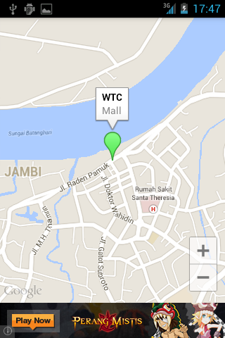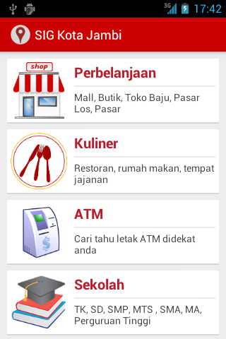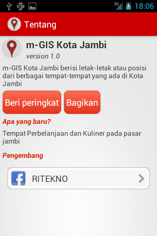 Sistem Informasi Geografis Kota jambi berisi berbagai tempat-tempat menarik di kota jambi meliputi tempat kuliner, tempat perbelanjaan, sekolah, dain tempat lainnya.Jambi City Geographic Information System contains a variety of interesting places in the city of Jambi include culinary, shopping, schools, dain other places.