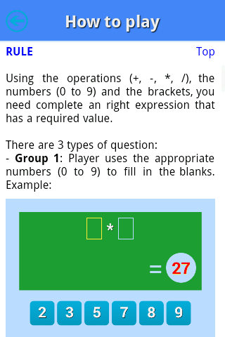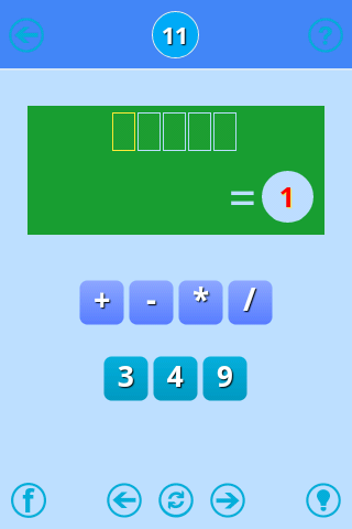 It's simple. Using the operations (+, -, *, /), the numbers (0 to 9) and the brackets, you need complete an right expression that has a required value.