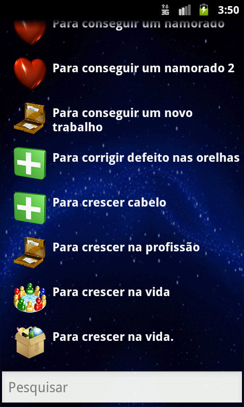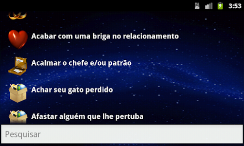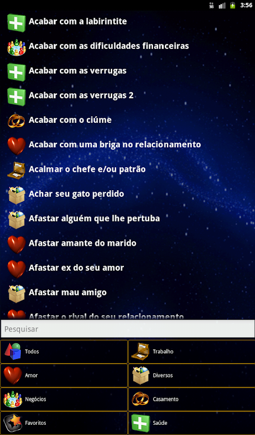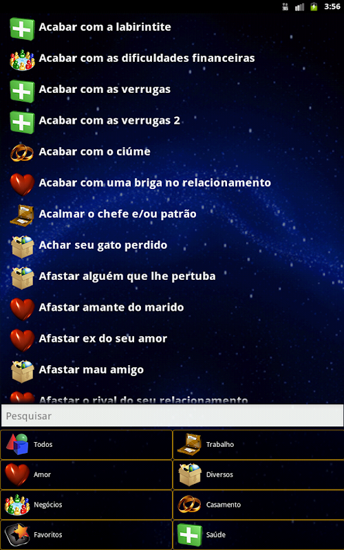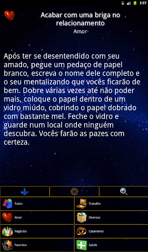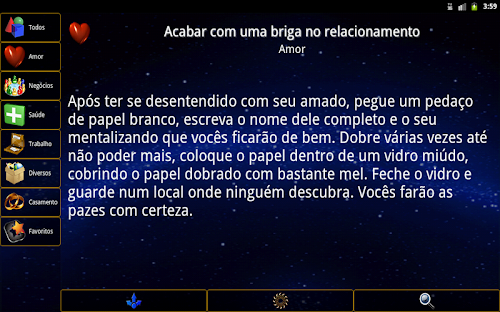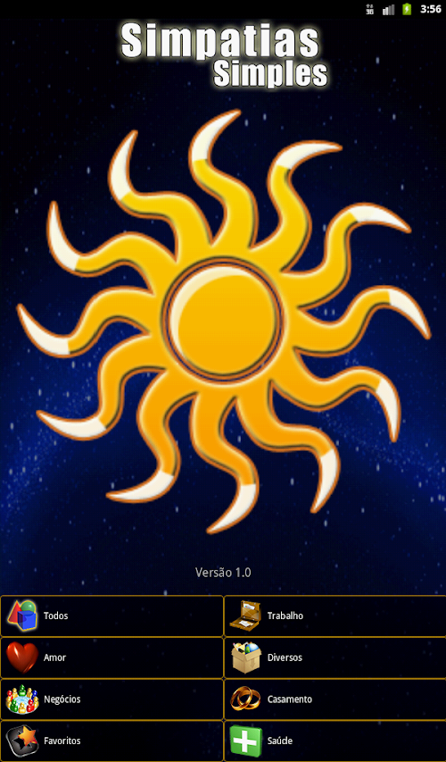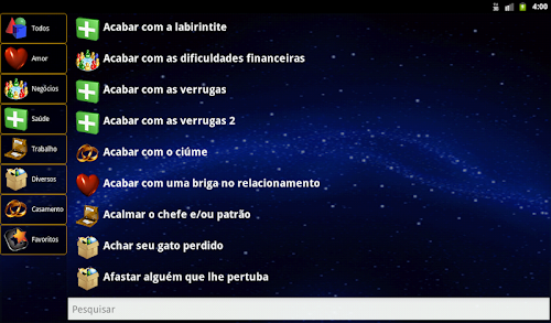 Permite filtrar por categoria, criar uma lista de favoritos, compartilhar via SMS / E-mail / redes sociais, ...A full application of simple and easy to make sympathies. Categories are organized by: