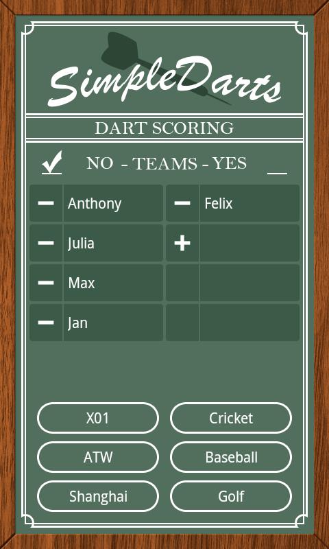 - X01, Cricket, Baseball, Around the World, Shanghai and Golf (Single players and teams)
